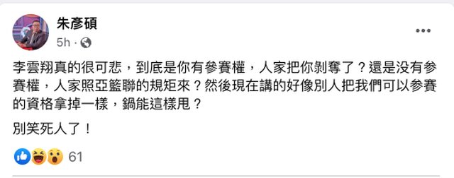李雲翔真的很可悲,到底是你有參賽權,人家把你剝奪了? 還是没有参賽權,人家照亞籃聯的規矩來? 然後現在講的好像別人把我們可以参賽的資格拿掉一樣,鍋能這樣甩? 別笑死人了! 朱大再度對籃協開跑 希望這次真的可以改變籃協環境 也請各位鄉民跟著 Beauty大大一起加入籃協 監督這個只會辦瓊斯盃的組織 -- ※ 發信站: 批踢踢實業坊(www.ptt-site.org.tw), 來自: 114.25.52.238 (臺灣) ※ 文章網址: https://www.ptt-site.org.tw/basketballTW/M.1694272174.A.96F