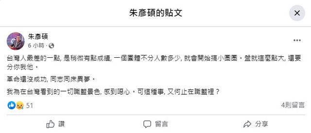 台灣人最差的一點, 是稍微有點成績, 一個團體不分人數多少, 就會開始搞小圈圈。 盤就這麼點大, 還要分你我他。 革命還沒成功, 同志同床異夢。 我為在台灣看到的一切職籃景色, 感到噁心。可這種事, 又何止在職籃裡? https://i.imgur.com/mCKEz2k.jpg
