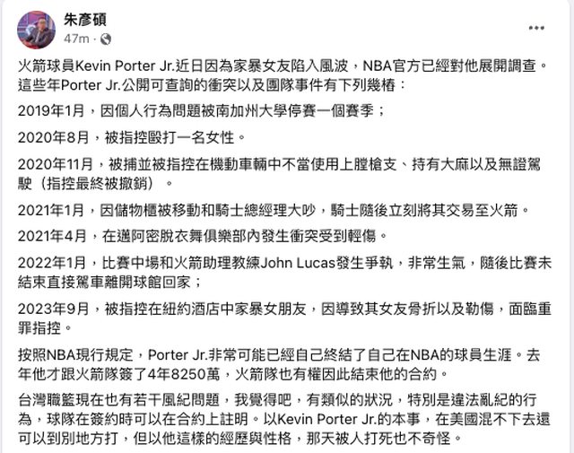 火箭球員Kevin Porter Jr.近日因為家暴女友陷入風波,NBA官方已經對他展開調查。這 些年Porter Jr.公開可查詢的衝突以及團隊事件有下列幾樁: 2019年1月,因個人行為問題被南加州大學停賽一個賽季; 2020年8月,被指控毆打一名女性。 2020年11月,被捕並被指控在機動車輛中不當使用上膛槍支、持有大麻以及無證駕駛(指 控最終被撤銷)。 2021年1月,因儲物櫃被移動和騎士總經理大吵,騎士隨後立刻將其交易至火箭。 2021年4月,在邁阿密脫衣舞俱樂部內發生衝突受到輕傷。 2022年1月,比賽中場和火箭助理教練John Lucas發生爭執,非常生氣,隨後比賽未結束 直接駕車離開球館回家; 2023年9月,被指控在紐約酒店中家暴女朋友,因導致其女友骨折以及勒傷,面臨重罪指 控。 按照NBA現行規定,Porter Jr.非常可能已經自己終結了自己在NBA的球員生涯。去年他才 跟火箭隊簽了4年8250萬,火箭隊也有權因此結束他的合約。 台灣職籃現在也有若干風紀問題,我覺得吧,有類似的狀況,特別是違法亂紀的行為,球 隊在簽約時可以在合約上註明。以Kevin Porter Jr.的本事,在美國混不下去還可以到別 地方打,但以他這樣的經歷與性格,那天被人打死也不奇怪。 備註 有啊,台灣職籃規章都有寫清楚,只是不知何年何月開完會啊 賭博,家暴,砸車,鬥毆都沒定案欸XD -- ※ 發信站: 批踢踢實業坊(www.ptt-site.org.tw), 來自: 114.25.32.51 (臺灣) ※ 文章網址: https://www.ptt-site.org.tw/basketballTW/M.1694586428.A.8D7