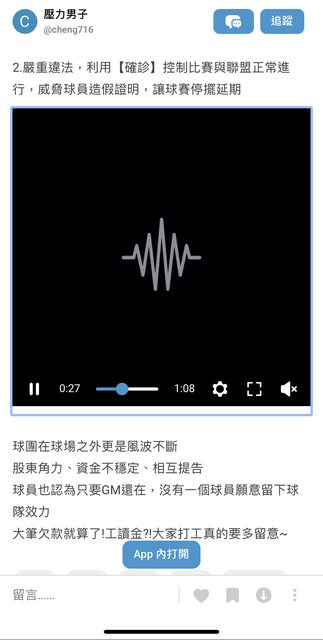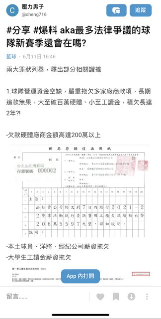 原文來源: https://bit.ly/3ZmR5Mf 已刪文 二、D卡爆料 今年6/11, cheng716在D卡爆料,指控某球團嚴重欠薪,威脅球員造假確診,股東內訌互相 提告,並公布了一段錄音檔,但此文章當晚就刪除。 以下D卡全文 https://i.imgur.com/FyIK4BE.jpg