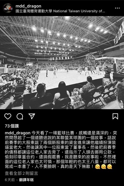 一、跑車男IG發文 今年四月中,台中太陽股東跑車男在IG發了一個意味深長的文章,並在一個禮拜後將此文章 刪除,更把之前有關台中太陽的貼文全數刪除。 以下IG全文 今天看了一場籃球比賽,感觸還是蠻深的,突然間想起了一個道聽塗說的某聯盟某球團的一 個故事,話說前賽季的大股東誆了兩個新股東的資金進來讓他繼續扮演裝逼當老大,然後讓 其中一位股東當了董事長,然後把前賽季的債務都讓這位老人家去背了,還指示了人頭去挪 用公款,偷刻印章蓋合約,還搞假罷賽,我是聽來的故事啦,不然裡面的這位老人家也太可 憐,那個年輕的也太王八蛋,都可以寫成一本書了,人不要臉啊,真的是天下無敵 https://i.imgur.com/flO5Yxj.jpg