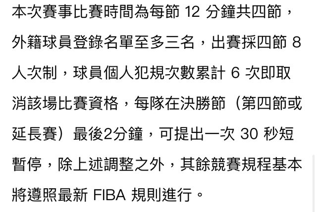 夢想聯動交流賽本次賽事比賽時間為每節 12 分鐘共四節,外籍球員登錄名單至多三名,出 賽採四節 8 人次制,球員個人犯規次數累計 6 次即取消該場比賽資格,每隊在決勝節(第 四節或延長賽)最後2分鐘,可提出一次 30 秒短暫停,除上述調整之外,其餘競賽規程基 本將遵照最新 FIBA 規則進行。 https://i.imgur.com/Yxf95Oz.png