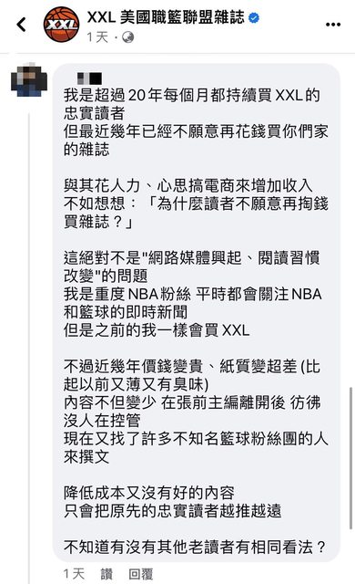 其實蠻認同這位籃球同好的觀點 紙本雜誌式微真的是閱讀習慣改變造成的嗎? 售價變貴、內容又變差應該才是主因吧? 我也是比較喜歡張瓏正時期的XXL 還記得剛開始買的時候一本是$120元 只能說這幾年物價漲太兇了吧 https://myppt.cc/sqqDtk -- ※ 發信站: 批踢踢實業坊(www.ptt-site.org.tw), 來自: 223.137.25.141 (臺灣) ※ 文章網址: https://www.ptt-site.org.tw/basketballTW/M.1695148241.A.E9F