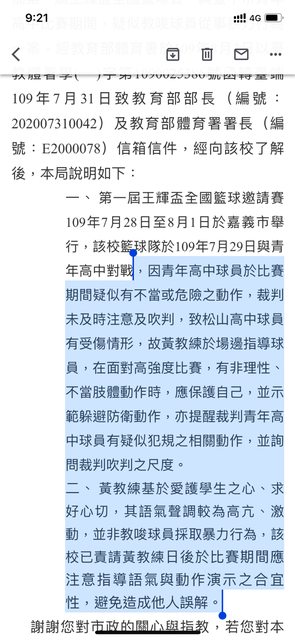 因青年高中球員於比賽期間疑似有不當或危險之動作,裁判未及時注意及吹判,致松山高 中球員有受傷情形,故黃教練於場邊指導球員,在面對高強度比賽,有非理性、不當肢體 動作時,應保護自己,並示範躲避防衛動作,亦提醒裁判青年高中球員有疑似犯規之相關 動作,並詢問裁判吹判之尺度。 黃教練基於愛護學生之心、求好心切,其語氣聲調較為高亢、激動,並非教唆球員採取暴 力行為,該校已責請黃教練日後於比賽期間應注意指導語氣與動作演示之合宜性,避免造 成他人誤解。 這件事後來也沒有後來了 真要說就是 黃教練依然是學生運動教育的翹楚 而其他反對的人才是有問題的人 -- ※ 發信站: 批踢踢實業坊(www.ptt-site.org.tw), 來自: 27.51.80.214 (臺灣) ※ 文章網址: https://www.ptt-site.org.tw/basketballTW/M.1695778279.A.3E1