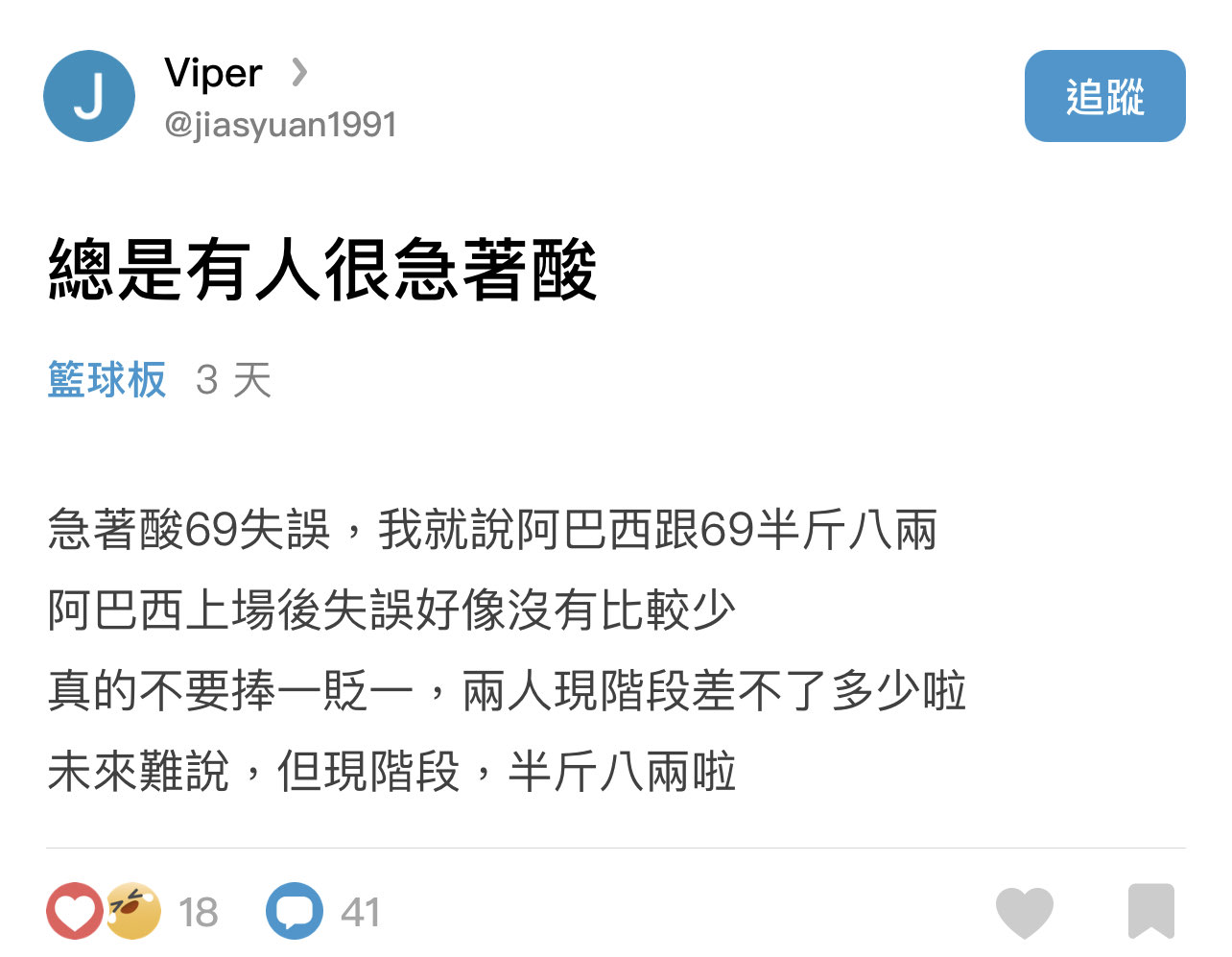 pounil : 劉錚的防守箭頭也可以分擔給阿巴西一點 10/02 14:48