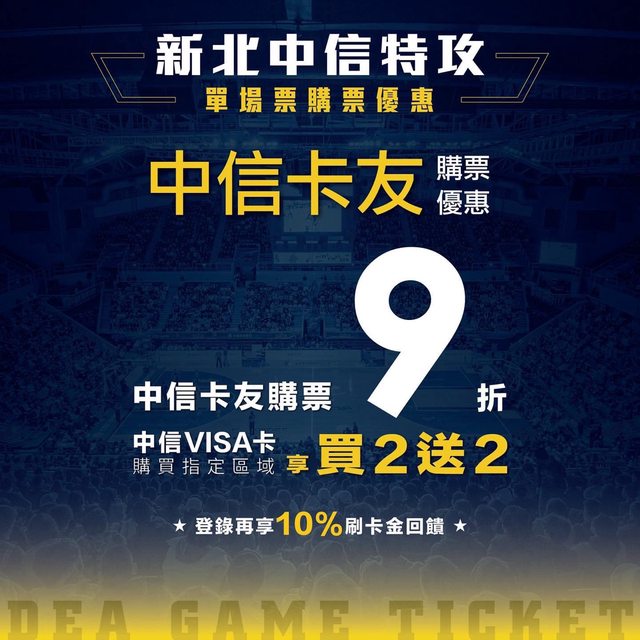 中信卡友例行賽購票9 折、刷VISA卡再享3F線人席買2 送2 :