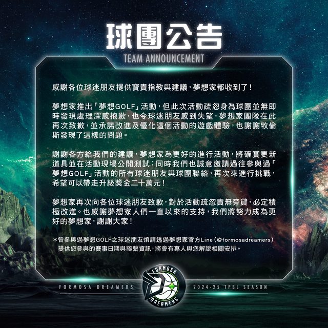 : 夢想家推出「夢想GOLF」活動,但此次活動疏忽身為球團並無即時發現處理深感抱歉,也