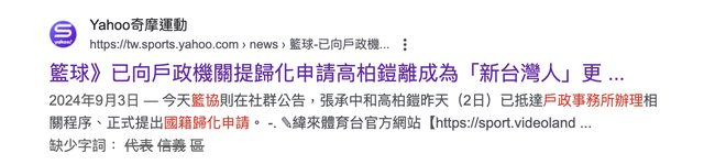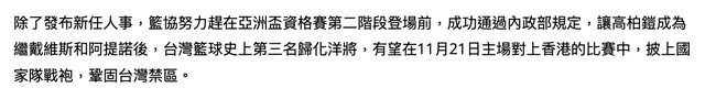 籃協努力趕在亞洲盃資格賽第二階段登場前,成功通過內政部規定,讓高柏鎧成為繼戴維