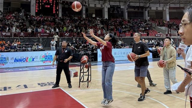 ▲安芝儇姊姊安喜善(短髮紅衣者)12月1日現身台鋼獵鷹主場,中場時間還上場挑戰投籃遊戲。(圖/2S娛樂公司提供)