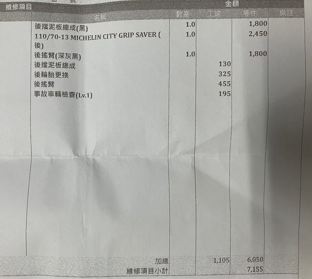 : 更換的零件有擋泥板+車牌架總成、後輪米其林city grip saver、後搖臂