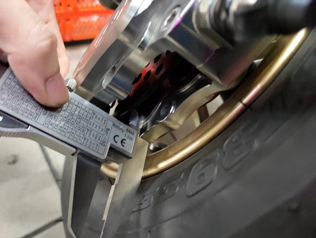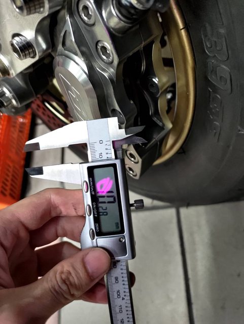 靠外邊的卡鉗活塞座與碟盤距離為10.28mm 輪胎側為9.28mm