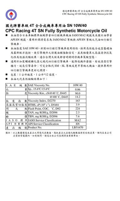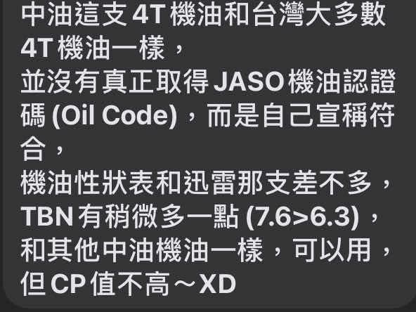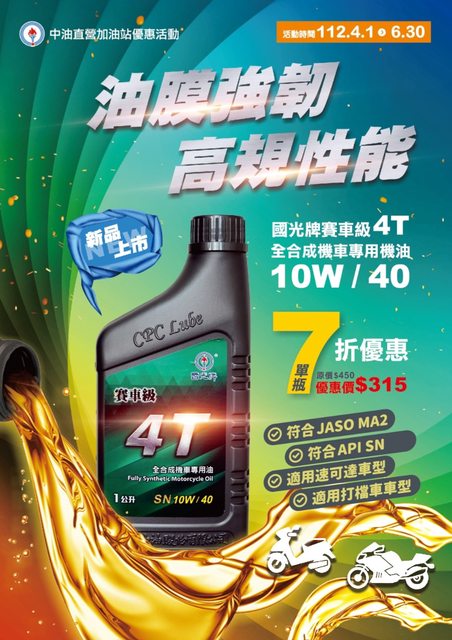 以往中油只有汽車版的賽車級機油 最近新推出了專門為機車所設計的4T全合成機油 對於使用檔車的族群又多了一個選擇 雖然我本身騎速克達 平常都使用力魔全合成的汽車機油 但看了新產品上市 加上中油官方評測數據也都蠻不錯的 剛好現在正在特價中 於是買了一罐來測試 之後會再附上一篇心得分享 是否也有使用過這罐機油的車友呢 歡迎一起討論 https://i.imgur.com/UMrwqFu.jpg
