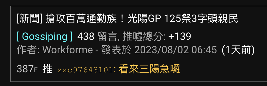 噓 navysoider: 看來光陽急囉,以為這邊跟八卦版一樣 112.78.85.23 08/04 06:03