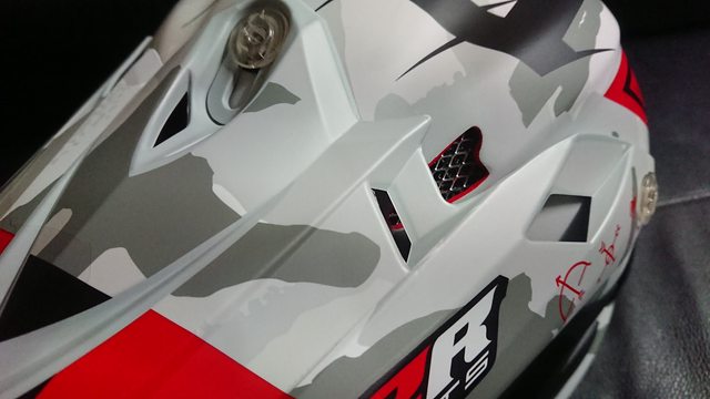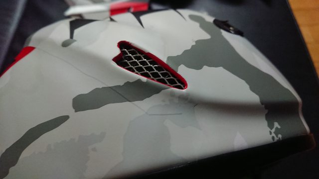 而上方從側面一直延伸到後方紅色區域, 主要的修飾只有這個應該就亂畫的圖案? 至少我看不出來代表什麼,圖案左右都是相同的。 同時這邊也可以看到後方的排氣口以及側面的帽簷鎖點。