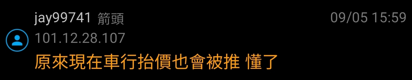 → jay99741: 原來現在車行抬價也會被推 懂了 101.12.28.107 09/05 15:59