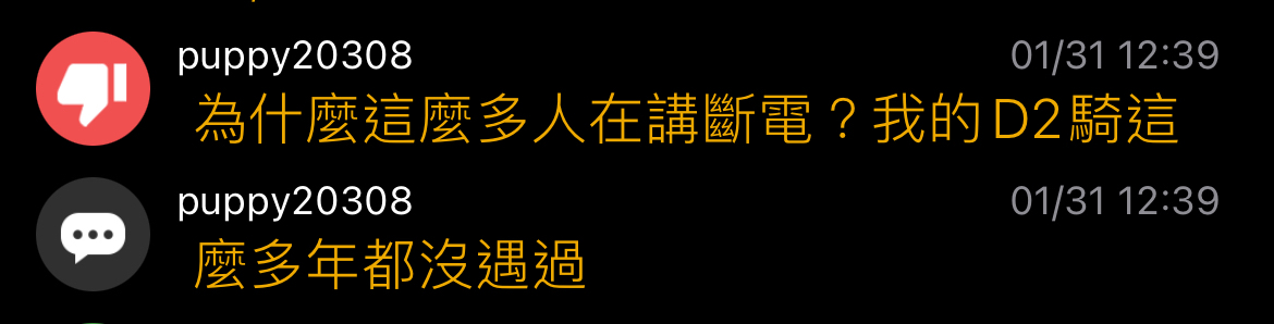 噓 puppy20308: 為什麼這麼多人在講斷電?我的D2騎這 1.173.45.46 01/31 12:39