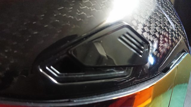 額頭兩側有另外的進氣口,依然是滑蓋式的設計。 這邊看似有半開的段落設計,但騎乘上,很難調整到半開。 自己都當只有全開跟全關使用。