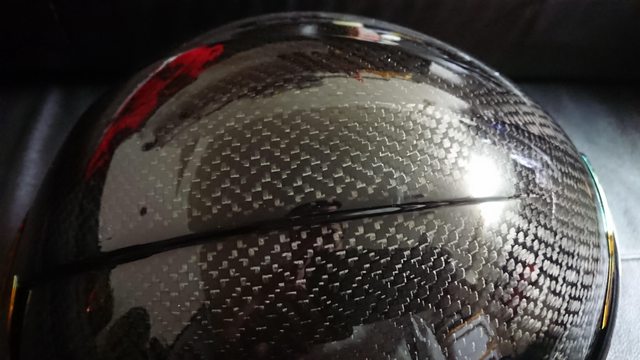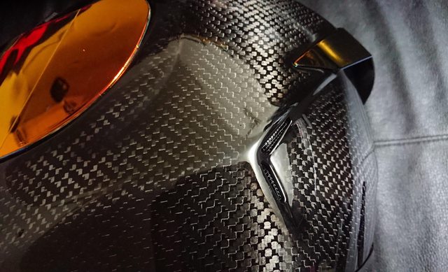 安全帽本體, 因為室內光源實在有夠難拍,直接拿一張外面拍的頂著。 配色整體是亮面碳纖維原色,搭配一些電鍍紅的開關配件來點綴。