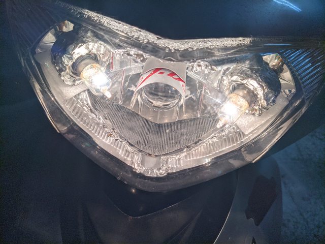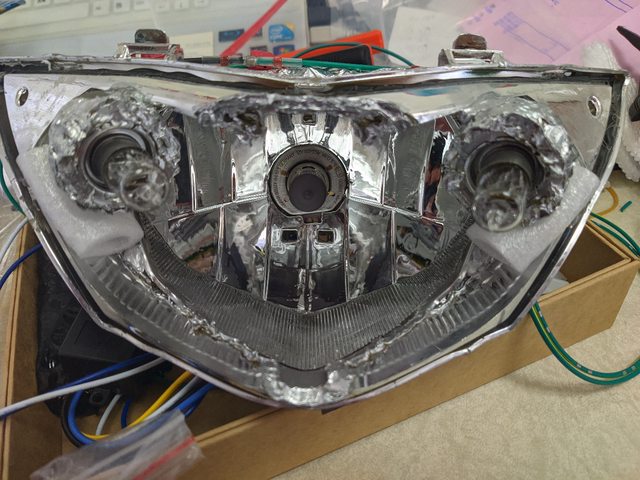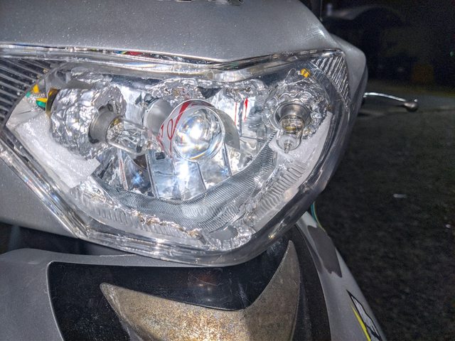 原本是將鹵素大燈換成h6的毛毛蟲魚眼(近黃遠白),且在燈座下半圈墊上水管橡皮墊片,