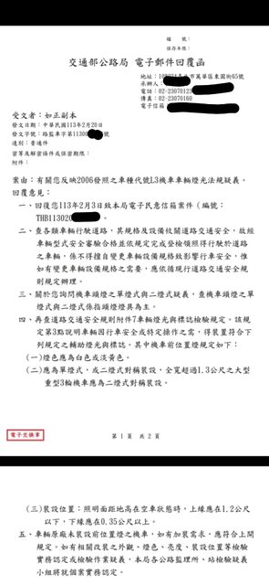 主旨 :2006發照之車種代號L3機車車輛燈光法規疑義