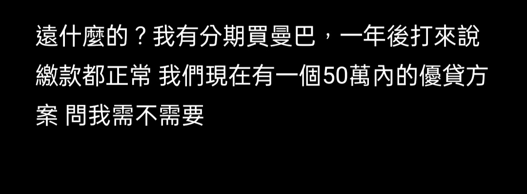 → a1121210: 有沒有貸款需求? 沒有 27.240.202.92 07/09 12:53
