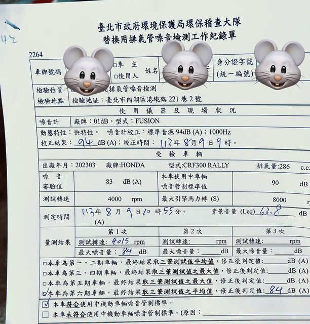 額外心得:其實現在的測試條件對老車真的很嚴格,我前面有一個應該是CB1300的大哥,不知道是不是年份的關係,他的噪音檢驗要低於87分貝所以他驗出來約93,就沒驗過了。
