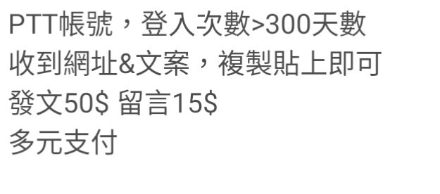 → Minihil: 哇 PTT行情比較好欸 因為帳號比較珍貴? 1.172.211.231 10/19 20:23