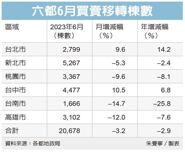 六都地政局昨(3)日公告6月買賣移轉棟數,共20,678棟,月減3.2%、年減2.9%,創近三