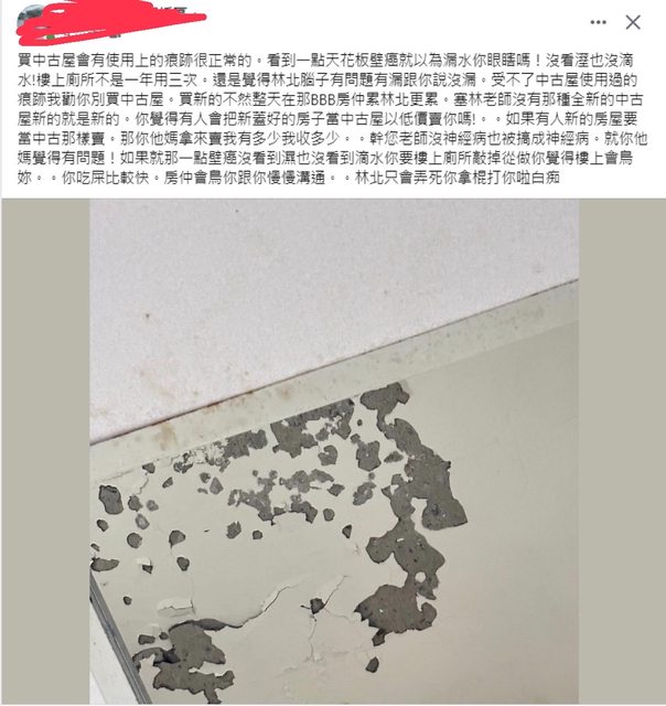 不然遇到有一點點問題就要別人全賠的買方我們也很頭痛,當然簽約前的屋況確認很重要,但有時候是櫃子天花板拆掉才發現的,尤其公寓屋齡動輒40年以上,要吵吵不完了