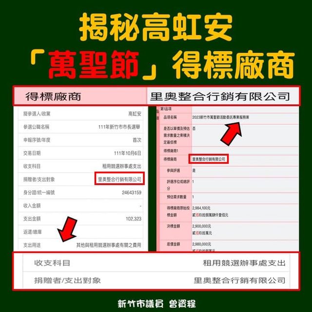 在高虹安市長選舉時,幫她支付競選辧事處的費用,在高上任後就拿了2個標案,而里奧公