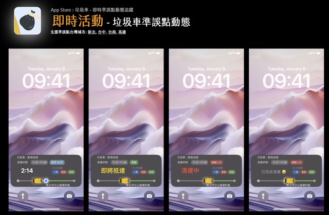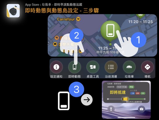 即時活動結合動態島,加上垃圾車自動追蹤功能,透過獨家演算法,提供垃圾車準點資訊