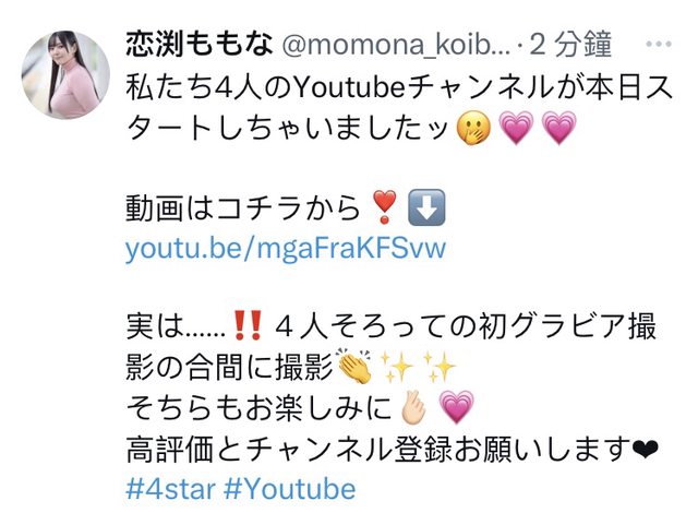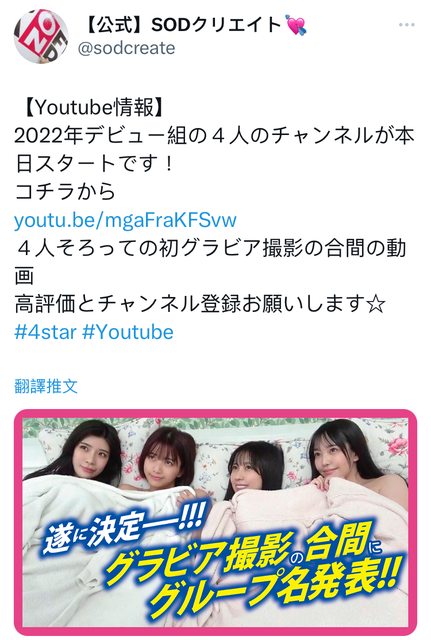 SOD Stars去年出道的新生代強力四天后 小湊よつ葉、神木麗、星乃莉子、恋渕ももな 一起開YT頻道囉!第一支影片養眼畫面不少 https://youtu.be/mgaFraKFSvw
