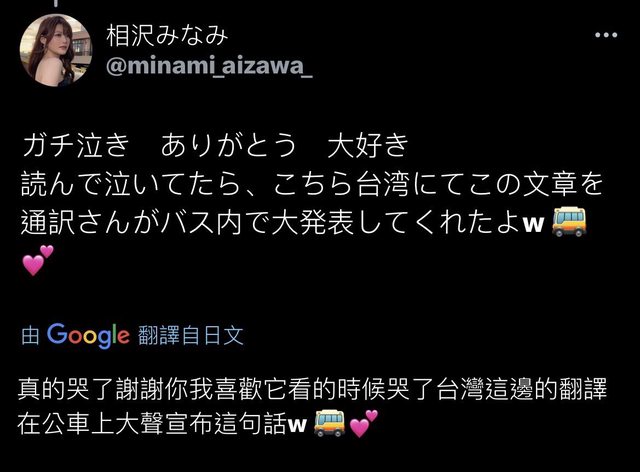 之後騎電動腳踏車繞潭 大合照 小南上車前 還買個蛋捲 吃得很開心 幾乎整盒吃光 上車後回台中 車程到了一半 原本是上車睡覺 下車尿尿 導遊說小南有事要和大家分享 她的好朋友伊藤舞雪回復她的引退文章 導遊一邊翻譯 小南默默流淚(借用一下Google翻譯) 小南真是性情中人 令人為之動容 https://i.imgur.com/WBUWYGv.jpg