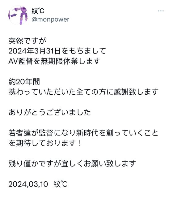 標題[情報] 紋℃ 導演宣布無限期休業