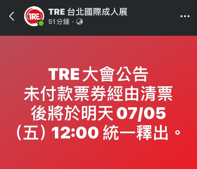 TRE大會公告 未付款票券經由清票後將於明天07/05(五)12:00 統一釋出。 https://i.imgur.com/2PIrsVY.jpeg
