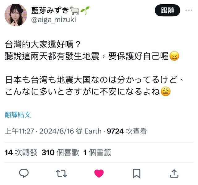 看到這次有去見本人的兩位女優的動態覺得很有趣就來分享一下 藍芽みずき 關心今天台灣的地震,暖! X https://i.imgur.com/eTR3RZm.jpg