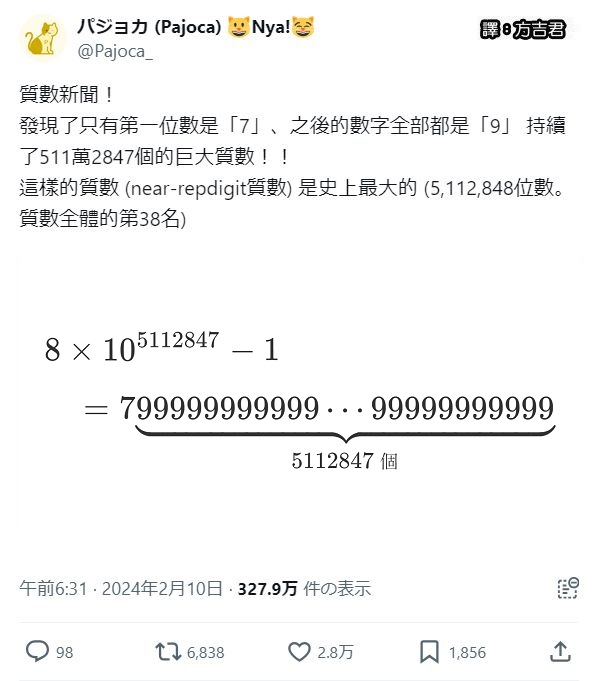 b150427: 質數那個不太懂,倒數第二句說是史上最大的,那最後一句 02/22 19:10