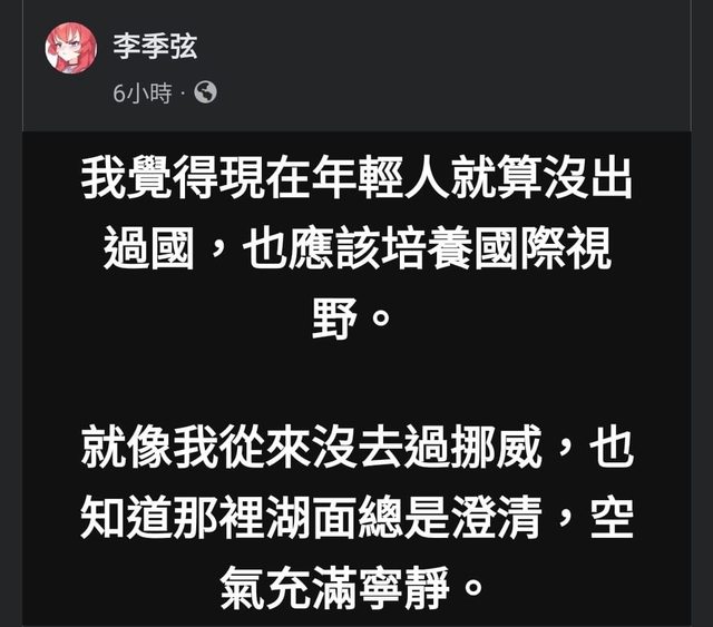 我覺得現在年輕人就算沒出過國, 也應該培養國際視野。 就像我從來沒有去過挪威, 也知道那裡湖面總是澄清, 空氣充滿寧靜。 https://i.imgur.com/cBfKYLx.jpg