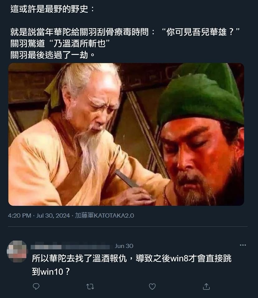推 if4: 華大夫怎麼不跟關羽說:溫酒是誰?武功強嗎?幫我報仇 ORZ 08/02 01:00