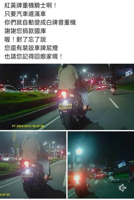 推 Stupidog5566: 我看過跟著汽車在那邊塞 不來機車道暢行無阻的黃牌 10/21 13:21