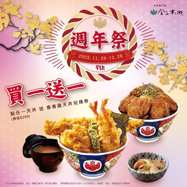 【週年祭專屬優惠 天丼買一送一】 歡慶來台九年,感恩回饋廣大朋友 \11/09-11/19 (每週四~日,共8天)/ 凡點購任一天丼系列商品乙碗,即贈免費香香雞天丼兌換券(原價299元) 乙張。 重金日本進口主要食材與設備 經職人用心的堅持與細心把關 原汁原味重現江戶時代的風味 在微涼的秋季 誠摯邀請您來品嚐日本第一職人天丼的美味! 活動門市:金子半之助全台門市。 兌換券使用注意事項 ① 優惠不得合併使用,不可折換現金及找零。 ② 兌換券使用時間:11/20(一)至12/28(四)止,限平日週一至週四使用。 #週年祭 #週年慶 ------------------------ #日本第一職人天丼 #金子半之助 https://i.imgur.com/WA2iO56.jpg