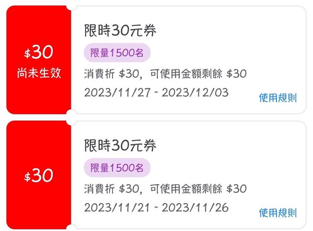 上次是100元(50/50) 這次縮水了 剩下60元 一樣分兩次 11/21~11/26、11/27~12/03各30元 注意這次每階段使用時間是6天 不是一個禮拜 -- ※ 發信站: 批踢踢實業坊(www.ptt-site.org.tw), 來自: 104.28.200.15 (臺灣) ※ 文章網址: https://www.ptt-site.org.tw/Lifeismoney/M.1700564339.A.A78
