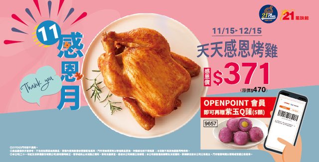 活動時間:11/15~12/15 活動內容: 到21世紀門市出示opapp會員畫面 可用原價79折($371)購買烤雞一份 另外會再加贈紫玉Q藷(5顆)一份 https://i.imgur.com/EEGgKKH.jpg