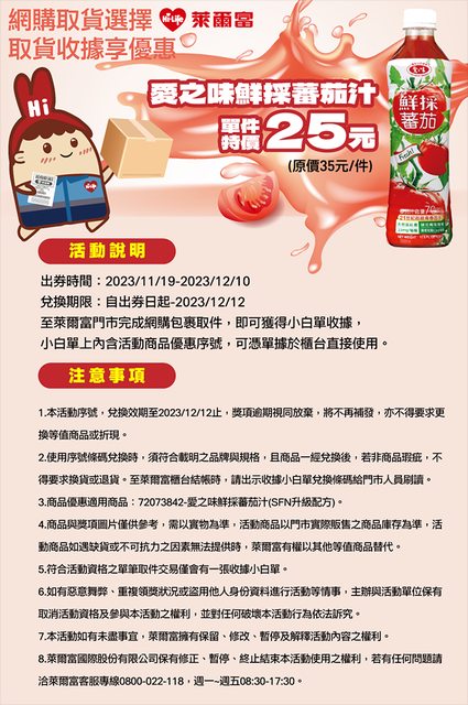 11/19~12/10 到萊爾去取網購商品 可以用25元加購愛之味番茄汁 https://i.imgur.com/RpPyrgJ.jpg