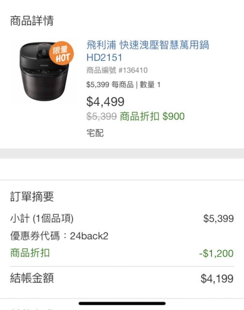 好市多特賣黑小萬HD2151 線上購物輸入折扣碼可以再折300 有好市多會員與壓力鍋需求的可以參考看看 https://i.imgur.com/SyEWvUm.jpg