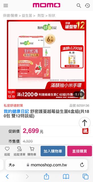 剛剛看到momo 我的健康日記蔓越莓益生菌6盒只要2699