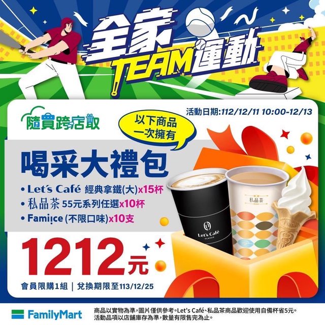 --- 另外還有隨買跨店取 【活動時間:112/12/11 10:00-12/13】 Let’s Caf曏g典拿鐵(大杯)X15杯 私品茶55元系列任選X10杯 Fami!ce(不限口味)x10支 共1212元 https://bit.ly/2Wvq1to https://i.imgur.com/MJP6Mgt.jpg