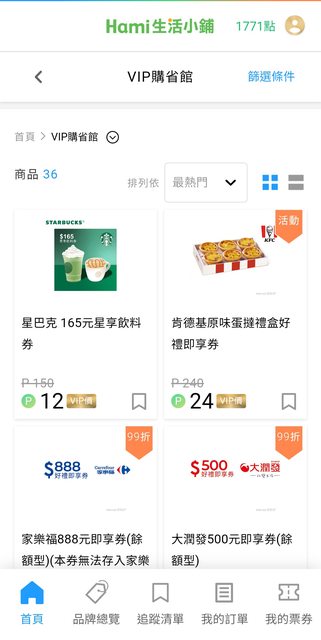 如題,今早11:00開放,數量有限,hami生活小舖VIP購省館, 12點換購星巴克165元等值飲品,24點換購肯德基原味蛋塔禮盒! 有符合中華電信VIP的手腳快一點。 https://hamipoint.cht.com.tw/store/vip?utm_source=HamiPay&utm_medium=Topic&utm_campaign=VIP http://i.imgur.com/bYRHRVk.jpg
