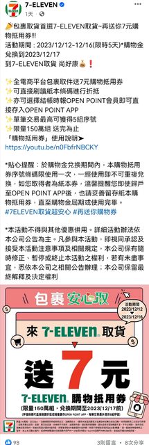 *貼心提醒:於購物金兌換期間內,本購物抵用券序號條碼限使用一次,一經使用即不可 重複兌換,如您取得者為紙本券,溫馨提醒您即使歸戶至OPEN POINT APP後,也請妥善留 存紙本購物抵用券,直至購物金屆期或使用完畢。 #7ELEVEN取貨超安心 #再送你購物券 -- ※ 發信站: 批踢踢實業坊(www.ptt-site.org.tw), 來自: 27.247.194.215 (臺灣) ※ 文章網址: https://www.ptt-site.org.tw/Lifeismoney/M.1702270904.A.F56