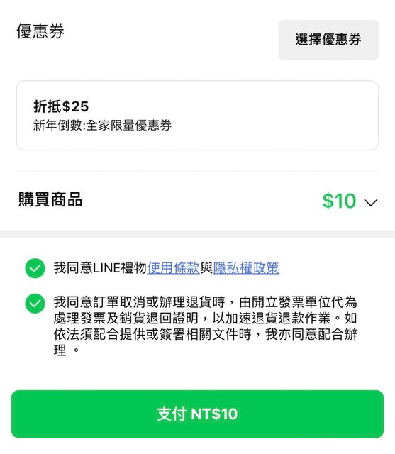 推 gjt0601: 想請問怎麼用line points折抵10元(無選項 61.224.104.113 12/13 16:13